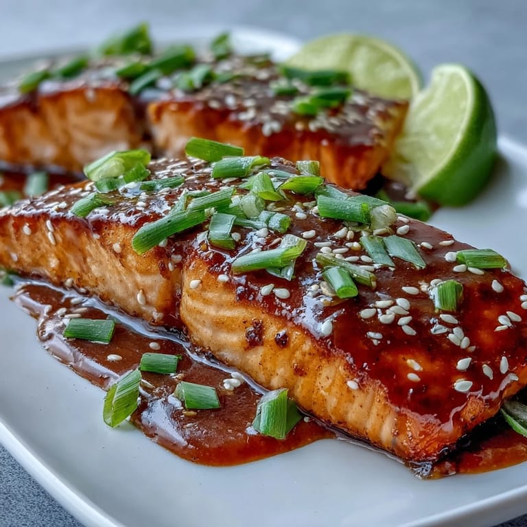 - Plate your cooked salmon, drizzle that gorgeous sauce all over, and top with green onions, sesame seeds, and lime wedges