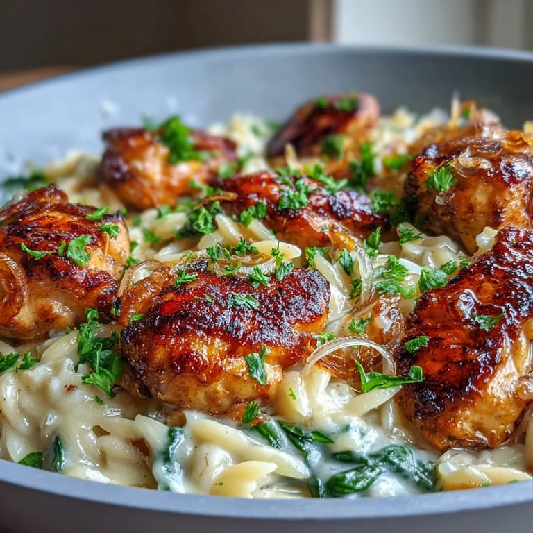 The genius of this dish is that it borrows from three different comfort food traditions and somehow lands as something entirely its own. You've got the creamy richness of chicken soup, the pasta-forward energy of a Mac and cheese situation, and that garlicky depth you'd find in an Italian cream sauce—all happening at once in one pan. The orzo is the secret weapon because it cooks in the sauce instead of separately, meaning it absorbs all that flavor as it hydrates rather than sitting naked in salted water waiting to be dressed.