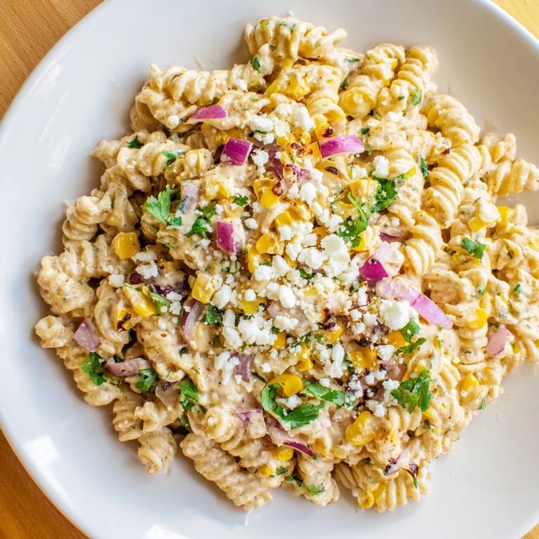Save There's something about street corn that stops me mid-summer. One afternoon, watching someone char corn kernels in a cast iron skillet at a farmers market, I realized elote didn't need to stay a handheld snack—it could transform into something you eat with a fork at a picnic table. That's when this pasta salad was born, creamy and bright, with all the comfort of that moment captured in every bite.
