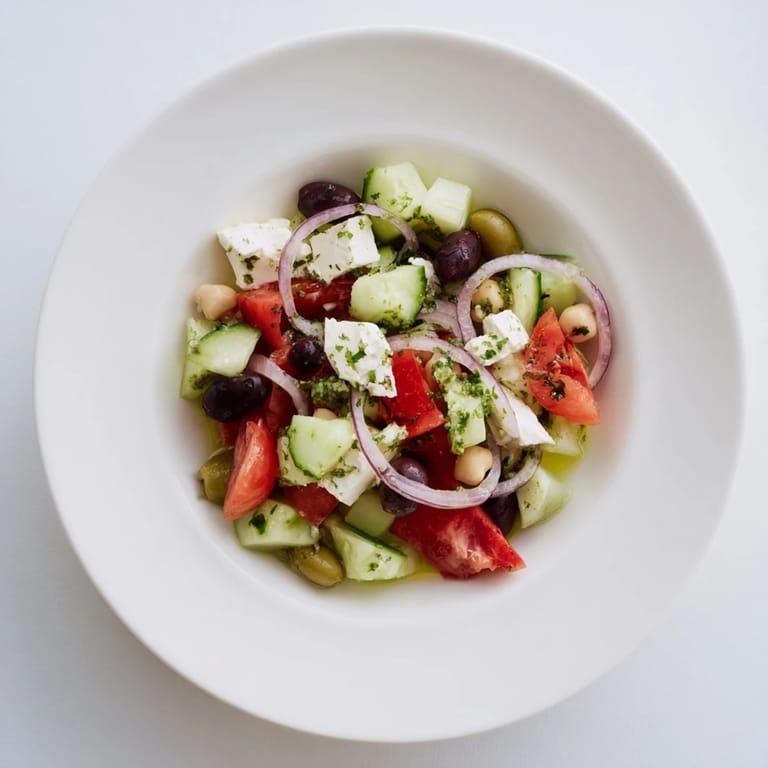 Save I was standing in my kitchen on a warm Tuesday afternoon, staring at a pile of vegetables I'd grabbed at the farmer's market without much of a plan. The cucumbers were cold and firm, the tomatoes still smelled like the vine, and I had a jar of Kalamata olives I'd been meaning to use. I started chopping without thinking too hard about it, and what came together was this salad—bright, crunchy, and so satisfying I ate half of it straight from the bowl. It's become my go-to whenever I need something quick that doesn't feel like I'm just throwing lunch together.