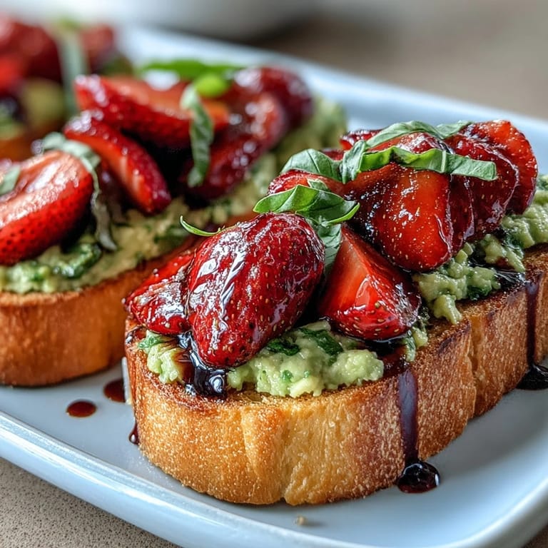 Picture a sunny morning table set with mismatched floral plates, a pitcher of sparkling rosé, and plates of this gorgeous avocado toast at the center. The sourdough is toasted to a perfect golden crisp, the avocado is lightly seasoned with sea salt, lime, and a hint of chili, and the strawberries are glossy and bright, tossed with honey and fresh basil. A generous drizzle of homemade balsamic glaze ties everything together into one unforgettable bite. This is the kind of dish that makes your friends ask for the recipe before they've even finished their first slice.