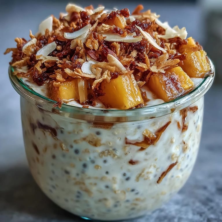 Serve these tropical overnight oats in clear glasses or jars to showcase the beautiful layers. For a breakfast gathering, set up a toppings bar with extra toasted coconut, fresh fruit, and a drizzle of coconut cream. These oats make a perfect grab-and-go breakfast, but they also shine as part of a brunch spread. Pair with a glass of cold brew coffee or a tropical herbal tea for a complete morning experience.