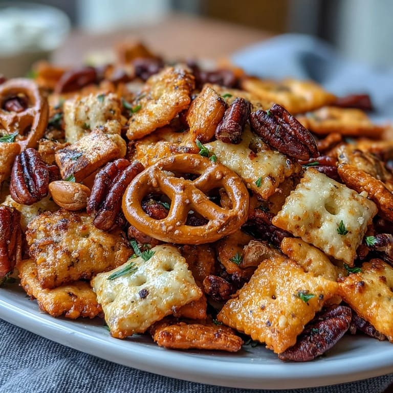 Save My neighbor showed up with a container of homemade Cheez-Its one afternoon, and I became instantly obsessed with recreating them but with a sourdough twist. There's something about the tang of sourdough meeting sharp cheddar that just clicks, and when I realized I could turn them into a full snack mix with nuts and pretzels, it felt like the perfect party solution. The first batch came out crackling and golden, and I couldn't stop sneaking handfuls while the rest cooled. My kitchen smelled like buttered cheese and toasted everything, and honestly, that's when I knew this recipe was a keeper.
