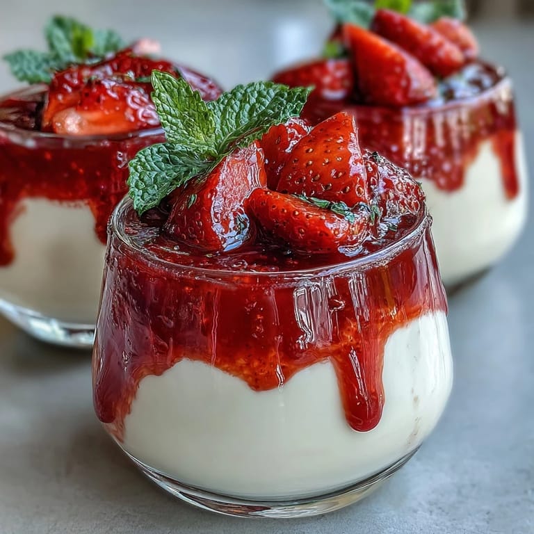 Panna cotta—literally "cooked cream" in Italian—has graced the tables of northern Italy for generations. Its magic lies in its simplicity: just a handful of ingredients, a gentle hand, and a little patience. The cream is warmed with sugar and a pinch of salt, brought together with bloomed gelatin, and kissed with vanilla before being poured into elegant glasses to set slowly in the refrigerator. Meanwhile, fresh strawberries are coaxed into a glossy, fragrant sauce with a touch of sugar and lemon juice. The result is a dessert that is at once airy and indulgent, delicate and bold—a true celebration on a plate.
